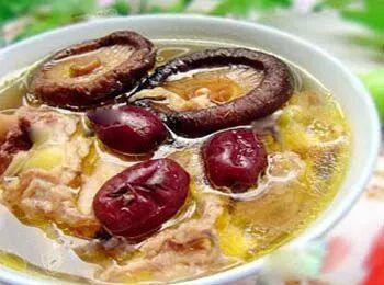 2.将大枣洗净,去核。用有盖炖盅,加进澄清过滤的泡发香菇的水和加入适量清水,再放入香菇、大枣、精盐、味精、料酒、姜片、熟花生油少许,盖上盅盖,上蒸笼蒸1小时左右。出笼即可食用。